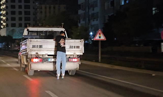 ADANA'da, patenli gencin kamyonetin arkasına tutunarak ilerleyişi kameraya yansıdı.Akşam saatlerinde merkez Seyhan ilçesi Mustafa Kemalpaşa Bulvarı'nda patenli genç, kamyonetin kasasına tutunarak ilerledi. O anlar ise başka bir araçtaki kişi tarafından cep telefonuyla kaydedildi. Görüntüde, arkadan gelen diğer araç sürücülerinin selektör yaptığı, kamyonet sürücüsünün ise aracını yolun sağına çektiği görüldü.