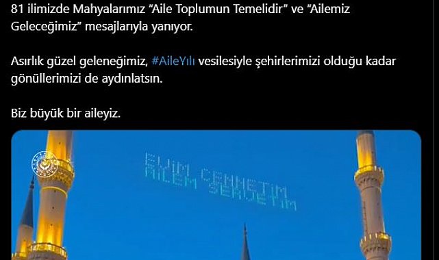 AİLE Yılı dolayısıyla ramazan ayının ikinci yarısında camilerdeki mahyalar, ailenin önemini vurgulayan mesajlarla süslendi. Ramazan ayının manevi atmosferini yansıtan mahyalar, 2025'in Aile Yılı ilan edilmesi dolayısıyla aile vurgusuyla ışıldıyor. Ülke genelinde camilere, 'Aile toplumun temelidir', 'Ailemiz geleceğimiz', 'Ailemiz servetimiz', 'Allah'ın rahmeti, peygamberin sünneti, en hayırlınız ailesine iyi davranandır' yazılı mahyalar asıldı. Aile ve Sosyal Hizmetler Bakanı Mahinur Özdemir Göktaş, sosyal medya hesabından yaptığı paylaşımda camilerdeki mahyaların yer aldığı videoya yer vererek, "Ramazan kadim değerlerimizin ve geleneklerimizin tazelendiği bir iklimdir. Bu mübarek ayda asırlık mahya geleneğimizi, toplumun en kıymetli yapı taşı olan aileye dair mesajlarla buluşturduk. 81 ilimizde mahyalarımız; 'Aile toplumun temelidir' ve 'Ailemiz geleceğimiz' mesajlarıyla yanıyor. Asırlık güzel geleneğimiz, Aile Yılı vesilesiyle şehirlerimizi olduğu kadar gönüllerimizi de aydınlatsın. Biz büyük bir aileyiz" dedi.
