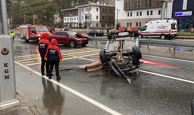 RİZE'de sürücüsünün kontrolden çıkan otomobil önce yanında seyreden cipe, ardından aydınlatma direğine çarpıp, takla attı. Kazada otomobil sürücüsü Mehmet Ali Tercan (45), hayatını kaybetti. Kaza, saat 17.00 sıralarında Rize- Güneysu karayolunda meydana geldi. Rize'den Güneysu ilçesine seyreden Mehmet Ali Tercan idaresindeki 53 AB 422 plakalı otomobil, sürücüsünün kontrolünden çıkıp, önce sağ şeridinde ilerleyen O. D. idaresindeki 61 NL 112 plakalı cipe, ardından aydınlatma direğine çarpıp takla attı. Kazada otomobil sürücüsü hayatını kaybederken, ihbar üzerine adrese çok sayıda ambulans, AFAD, jandarma ekipleri sevk edildi. Adrese ulaşan ekiplerce otomobil sürücüsünün cansız bedeni çıkarılırken, cenaze savcılık incelemesi ardından otopsi yapılmak üzere Adli Tıp'a kaldırıldı. Kaza sonrası cip sürücüsü şok geçirirken, sürücü sağlık kontrolü sonrası gözaltına aldı.KAZA ANI KAMERADAKaza anı ise çevredeki bir iş yerinin güvenlik kamerasına yansıdı. Görüntüde, sol şeritten gelen otomobilin önce sağ şeridindeki cipe, ardından aydınlatma direğine çarpıp takla attığı anlar yer aldı.