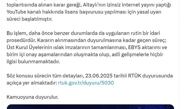 RADYO ve Televizyon Üst Kurulu (RTÜK) Başkanı Ebubekir Şahin, "Fatih Altaylı'nın izinsiz internet yayını yaptığı YouTube kanalı hakkında lisans başvurusu yapılması için yasal uyarı süreci başlatılmıştır" dedi.RTÜK Başkanı Şahin, sosyal medya hesabından yaptığı açıklamada, "Kamuoyunda, Fatih Altaylı'nın gözaltına alınmasıyla Üst Kurulumuzun yaptığı tebligat arasında bağ kuran yorumlar üzerine açıklama yapılması gereği doğmuştur. Radyo ve Televizyon Üst Kurulunun 27 Mart 2025 tarihli ve 2025/13 sayılı toplantısında alınan karar gereği, Altaylı'nın izinsiz internet yayını yaptığı YouTube kanalı hakkında lisans başvurusu yapılması için yasal uyarı süreci başlatılmıştır" dedi.'RUTİN PROSEDÜR'Şahin, "Bu işlem, daha önce benzer durumlarda da uygulanan rutin bir idari prosedürdür. Kararın alınmasından duyurulmasına kadar geçen süreç; Üst Kurul Üyelerinin ıslak imzalarının tamamlanması, EBYS aktarımı ve birim içi onay aşamalarından oluşmakta olup, adli gelişmelerle hiçbir ilgisi bulunmamaktadır. Söz konusu sürecin tüm detayları, 23 Haziran 2025 tarihli RTÜK duyurusunda açıkça yer almaktadır: https://rtuk.gov.tr/duyuru/5030" ifadelerini kullandı.
