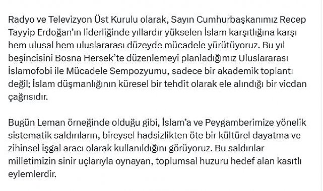 RADYO ve Televizyon Üst Kurulu (RTÜK) Başkanı Ebubekir Şahin, "RTÜK, İslamofobiyi sadece bir içerik sorunu değil; bir güvenlik, bir kimlik ve bir insanlık meselesi olarak görmektedir" dedi.RTÜK Başkanı Ebubekir Şahin, sosyal medya hesabından yaptığı açıklamada, "Leman denilen dergi müsveddesinde yer alan, Peygamber Efendimiz Hz. Muhammed'e (s.a.v.) yönelik alçakça karikatür, sadece İslam'a değil, aynı zamanda inanç özgürlüğüne, toplumsal barışa ve milyonlarca insanın kutsallarına yönelik sistematik bir nefret saldırısıdır. Bu sözde mizahın, ifade özgürlüğü kılıfı altında dine, inanca ve kutsallara hakarete dönüşmesini ibretle izlemekteyiz. Radyo ve Televizyon Üst Kurulu olarak, Sayın Cumhurbaşkanımız Recep Tayyip Erdoğan'ın liderliğinde yıllardır yükselen İslam karşıtlığına karşı hem ulusal hem uluslararası düzeyde mücadele yürütüyoruz. Bu yıl beşincisini Bosna Hersek'te düzenlemeyi planladığımız Uluslararası İslamofobi ile Mücadele Sempozyumu, sadece bir akademik toplantı değil; İslam düşmanlığının küresel bir tehdit olarak ele alındığı bir vicdan çağrısıdır" ifadelerini kullandı.'HAFIZAYI KORUMAKLA SORUMLUYUZ'İslam'a ve Hz. Muhammed'e yönelik saldırıların bireysel hadsizlikten öte bir kültürel dayatma ve zihinsel işgal aracı olarak kullanıldığını aktaran Şahin, "Bu saldırılar milletimizin sinir uçlarıyla oynayan, toplumsal huzuru hedef alan kasıtlı eylemlerdir. RTÜK olarak, sadece yayıncılığı denetleyen bir kurum değil; aynı zamanda kültürel egemenlik alanında, medyadaki nefret söylemine karşı etik çizgileri koruyan bir kamu otoritesiyiz. Bu anlayışla, Ankara Bilim Üniversitesi çatısı altında kurulan CENTERCIF-İslamofobi ile Mücadele Uygulama ve Araştırma Merkezi ile birlikte, akademik ve kurumsal düzeyde İslam karşıtlığına dair içerikleri kayıt altına alıyor, analiz ediyor, medya okuryazarlığı ve etik yayıncılık perspektifiyle kamuoyunu bilinçlendiriyoruz. RTÜK, İslamofobiyi sadece bir içerik sorunu değil; bir güvenlik, bir kimlik ve bir insanlık meselesi olarak görmektedir. Bugün bu topraklarda Hz. Muhammed'in (s.a.v.) ismine, hatırasına ve izzetine yönelik yapılan her saldırı, bu milletin hafızasında derin izler bırakır. Biz, bu hafızayı korumakla sorumluyuz. Bu vesileyle, başta medya olmak üzere tüm iletişim alanlarında İslam'a yönelik nefret söylemi ile karalama girişimlerine karşı mücadelemizi, tüm kurum ve kuruluşlarımızla birlikte kararlılıkla sürdüreceğimizi kamuoyuna bir kez daha ilan ediyoruz" açıklamasında bulundu.