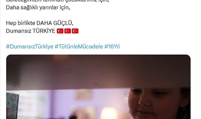 SAĞLIK Bakanı Kemal Memişoğlu, sosyal medya hesabından yaptığı 'dumansız Türkiye' paylaşımıyla, kapalı alanlarda sigara yasağının 16'ncı yıl dönümünü kutladı.Sağlık Bakanı Kemal Memişoğlu, kapalı alanlarda sigara yasağının 16'ncı yıl dönümünü dolayısıyla yaptığı paylaşımda, "Tütünle mücadelede 16'ncı yıl. Geleceğimizin teminatı çocuklarımız için, daha sağlıklı yarınlar için, hep birlikte daha güçlü, dumansız Türkiye" dedi.