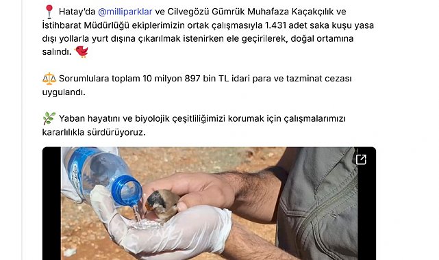 TARIM ve Orman Bakanı İbrahim Yumaklı, Hatay'da yasa dışı yollarla yurt dışına çıkarılmak istenirken ele geçirilen 1431 saka kuşunun doğal ortamına salındığını ve sorumlulara toplam 10 milyon 897 bin TL ceza uygulandığını duyurdu.Bakan İbrahim Yumaklı, NSosyal hesabından yaptığı açıklamada, "Hatay'da Doğa Koruma ve Milli Parklar Genel Müdürlüğü ve Cilvegözü Gümrük Muhafaza Kaçakçılık ve İstihbarat Müdürlüğü ekiplerimizin ortak çalışmasıyla 1431 adet saka kuşu yasa dışı yollarla yurt dışına çıkarılmak istenirken ele geçirilerek, doğal ortamına salındı. Sorumlulara toplam 10 milyon 897 bin TL idari para ve tazminat cezası uygulandı. Yaban hayatını ve biyolojik çeşitliliğimizi korumak için çalışmalarımızı kararlılıkla sürdürüyoruz" dedi.