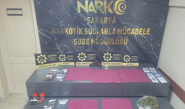 - SAKARYA'da polis ekipleri tarafından düzenlenen operasyonda uyuşturucu ticareti yaptıkları ileri sürülen 10 şüpheli gözaltına alındı. Sakarya Emniyet Müdürlüğü Narkotik Suçlarla Mücadele Şube Müdürlüğü ekipleri tarafından uyuşturucu madde satışı yaptığı belirlenen şüphelilerin Adapazarı, Akyazı ve Hendek ilçelerindeki adreslerine eş zamanlı operasyon düzenlendi. Operasyon kapsamında O.A. (30), H.A. (37), S.Ş. (40), M.H.S. (40), M.Ş.U. (57), T.H. (38), A.G. (38), M.A. (40), A.E. (32) ve G.A.S. (53) gözaltına alındı. Şüphelilerin ev ve araçlarında polis ekipleri tarafından arama yapıldı. Yapılan aramada 6 parça halinde satışa hazır 26 bin 156 içimlik sentetik kannabinoid hammaddesine emdirilmiş mor renkli peçete, 4 parça halinde 424,30 gram bonzai, 3 parça halinde 81,53 gram esrar, 31 sentetik ecza, 3 parça halinde 14,93 gram skunk, 2 parça halinde 3,40 gram metamfetamin, 3 ecstasy hap, 1 ruhsatsız tabanca, 15 fişek, uyuşturucu madde ölçümünde kullanılan bardak ile uyuşturucu kullanma aparatı ele geçirildi.