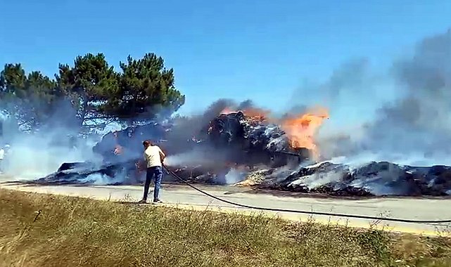 TEKİRDAĞ'ın Saray ilçesinde traktörün saman yüklü römorkunda çıkan yangın, biçilmiş buğday tarlasına sıçradı. Römork kullanılamaz hale geldi, tarım alanı zarar gördü.Saray ilçesi Yuvalı Mahallesi yakınlarında Süleyman Anılar'ın kullandığı traktörün saman balyası yüklü römorkunda yangın çıktı. Yangını fark eden sürücü, traktörü hemen römorktan ayırdı. Alevler kısa sürede büyüyüp, rüzgarın da etkisiyle yol kenarındaki biçilmiş buğday tarlasına sıçradı. Çevredekilerin ihbarı üzerine bölgeye jandarma ve itfaiye ekipleri sevk edildi. İtfaiye ekiplerinin müdahalesiyle alevler kontrol altına alınarak, söndürüldü. Yangında römork kullanılamaz hale gelirken, alevlerin sıçradığı tarım alanı zarar gördü. Jandarma yangının çıkış nedenini belirlemek için inceleme başlattı.