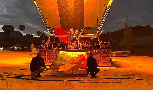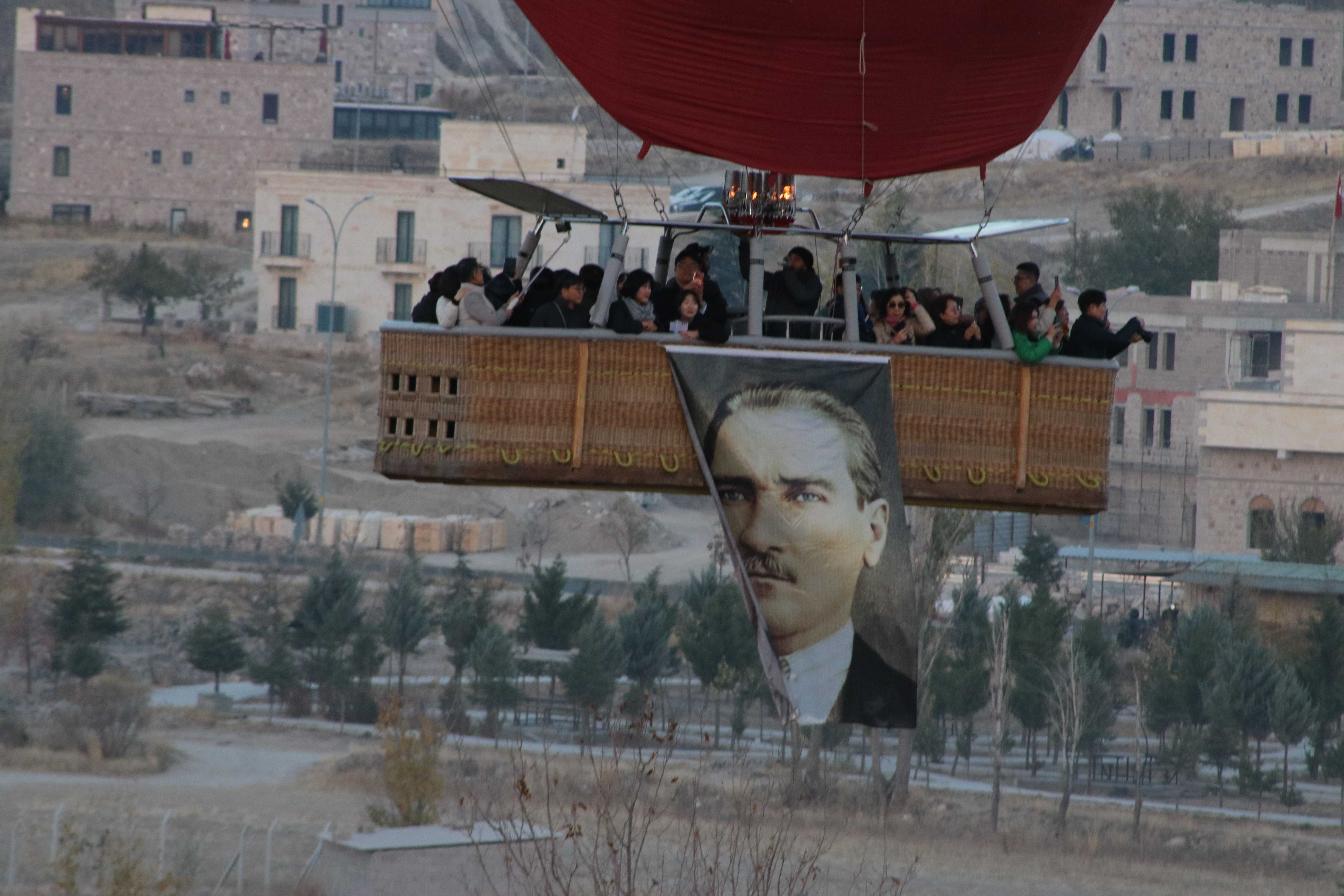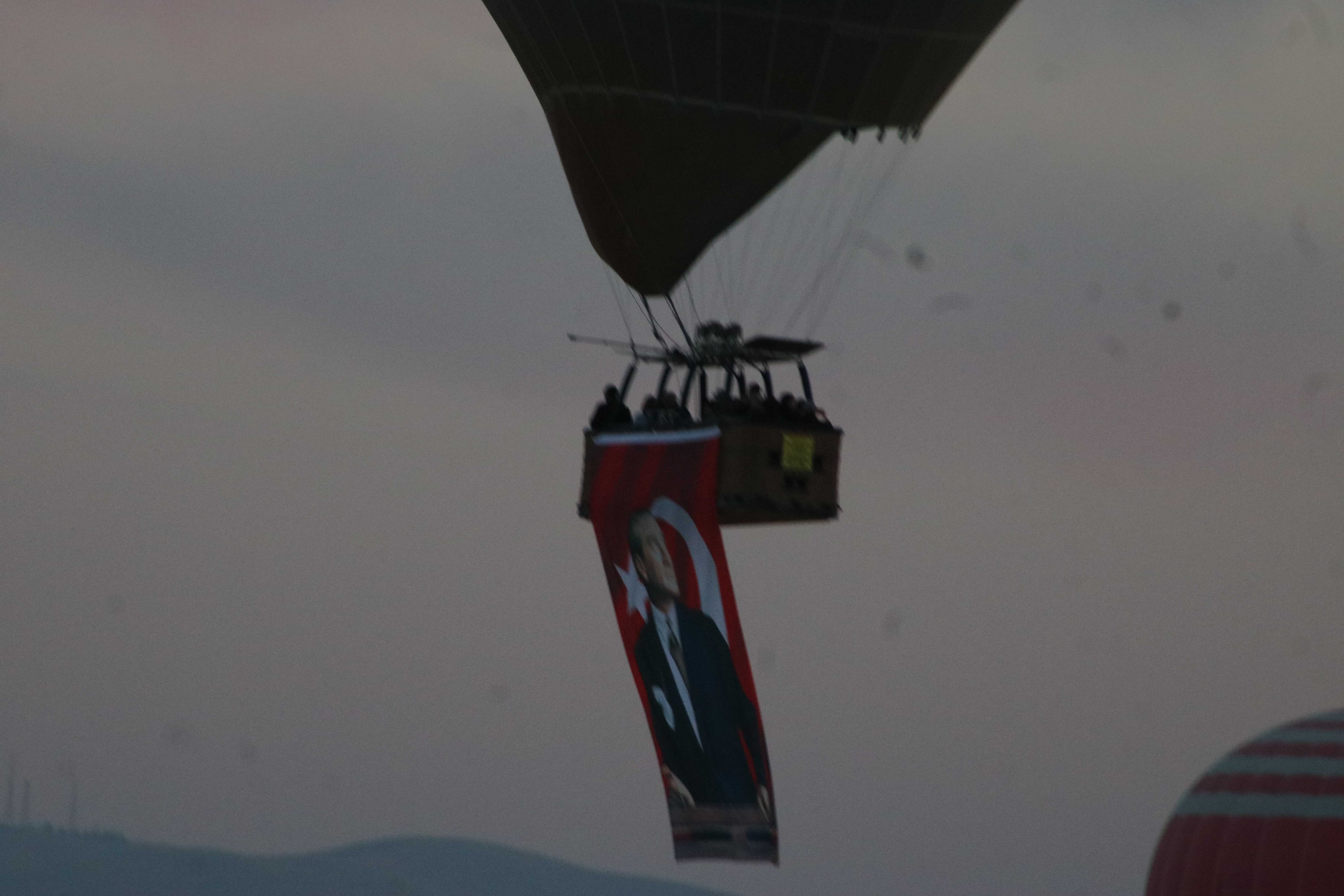 TÜRKİYE'nin önemli turizm merkezlerinden Kapadokya'da sıcak hava balonları, Ulu Önder Gazi Mustafa Kemal Atatürk'ün ebediyete irtihalinin 87'nci yıl dönümünde Atatürk posterleri ve Türk bayrakları ile havalandı.Kapadokya'da sabahın erken saatlerinde havalanan sıcak hava balonlarından bazılarının sepetlerine, Türkiye Cumhuriyeti'nin kurucusu Gazi Mustafa Kemal Atatürk'ün posterleri ve Türk bayrakları asıldı. Bölgeyi ziyaret eden yerli ve yabancı turistler, sıcak hava balonları ile fotoğraf çektirdi. Yaklaşık 1 saat Kapadokya semalarında uçan sıcak hava balonları, güzel görüntüler oluşturdu.