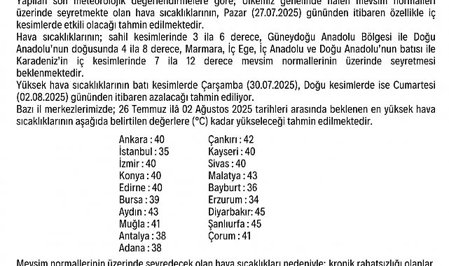 METEOROLOJİ Genel Müdürlüğü, ülke genelinde mevsim normalleri üzerinde seyreden hava sıcaklıklarının, 27 Temmuz Pazar gününden itibaren daha da etkili olacağını duyurdu.Meteoroloji Genel Müdürlüğü tarafından yapılan son meteorolojik değerlendirmelere göre; ülke genelinde mevsim normalleri üzerinde seyreden hava sıcaklıkları, pazar gününden itibaren özellikle iç kesimlerde etkili olacak. Hava sıcaklıklarının sahil kesimlerinde 3 ila 6 derece, Güneydoğu Anadolu Bölgesi ile Doğu Anadolu'nun doğusunda 4 ila 8 derece, Marmara, İç Ege, İç Anadolu ve Doğu Anadolu'nun batısı ile Karadeniz'in iç kesimlerinde 7 ila 12 derece mevsim normallerinin üzerinde seyretmesi bekleniyor. Yüksek hava sıcaklıklarının batı kesimlerde 30 Temmuz Çarşamba, doğu kesimlerde ise 2 Ağustos Cumartesi gününden itibaren azalması bekleniyor. 27 Temmuz ile 02 Ağustos arasında hava sıcaklıklarının Ankara'da 40, İstanbul'da 35, Çankırı'da 42, İzmir, Konya, Sivas, Edirne'de 40, Bursa'da 39, Aydın, Malatya'da 43, Muğla'da 41, Antalya, Adana'da 38, Diyarbakır ve Şanlıurfa'da 45 derece olması bekleniyor. Açıklamada, mevsim normallerinin üzerinde seyredecek hava sıcaklıkları nedeniyle; kronik rahatsızlığı olanlar, yaşlılar ve çocuklar başta olmak üzere vatandaşların günün en sıcak saatleri 11.00 ile 16.00 arasında açık alanda bulunmamaları konusunda dikkatli ve tedbirli olmaları istendi.EN SICAK YER KURTALAN OLDUÖte yandan Meteoroloji Genel Müdürlüğü verilerine göre dün 06.00 ile 18.00 saatleri arasında Siirt'in Kurtalan ilçesi, 49,1 derece ile Türkiye'nin en sıcak yeri oldu. Kurtalan'ı, Mardin'in Kızıltepe ilçesi 48,8 ve Şırnak'ın Cizre ilçesi 48,8 ile takip etti.