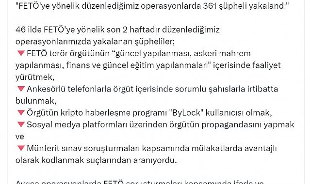 Yerlikaya, operasyonlarda 361 şüphelinin yakalandığını belirterek, "Operasyonlarımızda yakalanan şüpheliler; FETÖ terör örgütünün 'güncel yapılanması, askeri mahrem yapılanması, finans ve güncel eğitim yapılanmaları' içerisinde faaliyet yürütmek, ankesörlü telefonlarla örgüt içerisinde sorumlu şahıslarla irtibatta bulunmak, örgütün kripto haberleşme programı 'ByLock' kullanıcısı olmak, sosyal medya platformları üzerinden örgütün propagandasını yapmak ve münferit sınav soruşturmaları kapsamında mülakatlarda avantajlı olarak kodlanmak suçlarından aranıyordu. Operasyonlarda FETÖ soruşturmaları kapsamında ifade ve teşhislerde adları geçen, haklarında kesinleşmiş hapis cezası ve aranma kaydı olanlar da yakalandı. Valilerimizi, operasyonları koordine eden cumhuriyet başsavcılıklarımızı, il emniyet müdürlerimizi ve operasyonları gerçekleştiren kahraman polislerimizi tebrik ediyorum. Milletimizin birlik ve beraberliğine, devletimizin bütünlüğüne, vatandaşlarımızın huzuruna ve refahına kastedenlere karşı mücadelemize aralıksız devam ediyoruz" dedi.