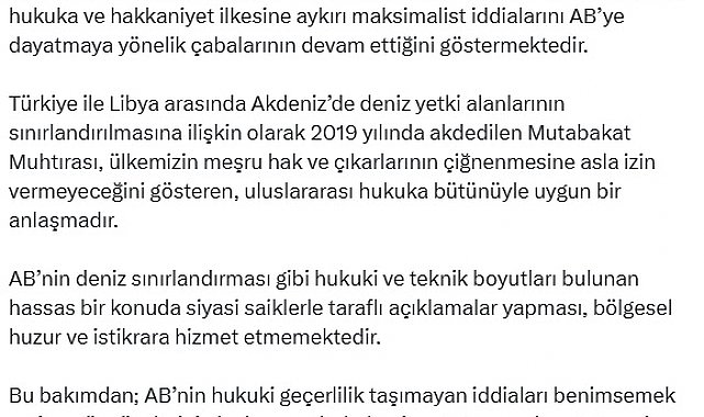 "26 Haziran 2025 tarihinde gerçekleştirilen Avrupa Birliği (AB) Liderler Zirvesi'nde kabul edilen sonuçlar, Yunanistan'ın ve GKRY'nin uluslararası hukuka ve hakkaniyet ilkesine aykırı maksimalist iddialarını AB'ye dayatmaya yönelik çabalarının devam ettiğini göstermektedir. Türkiye ile Libya arasında Akdeniz'de deniz yetki alanlarının sınırlandırılmasına ilişkin olarak 2019 yılında akdedilen Mutabakat Muhtırası, ülkemizin meşru hak ve çıkarlarının çiğnenmesine asla izin vermeyeceğini gösteren, uluslararası hukuka bütünüyle uygun bir anlaşmadır. AB'nin deniz sınırlandırması gibi hukuki ve teknik boyutları bulunan hassas bir konuda siyasi saiklerle taraflı açıklamalar yapması, bölgesel huzur ve istikrara hizmet etmemektedir. Bu bakımdan; AB'nin hukuki geçerlilik taşımayan iddiaları benimsemek yerine, tüm üyelerini uluslararası hukuka riayet etmeye davet etmesi gerekmektedir. Türkiye, Doğu Akdeniz'de meşru hak ve çıkarlarını uluslararası hukuk çerçevesinde kararlılıkla savunmaya devam edecektir."