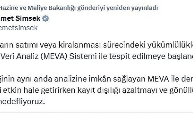 HAZİNE ve Maliye Bakanı Mehmet Şimşek, taşınmaz satımı veya kiralanması sürecindeki vergi yükümlülüklerinin Mekansal Veri Analiz (MEVA) Sistemi ile tespit edilmeye başlandığını açıkladı. Hazine ve Maliye Bakanlığı, gayrimenkullerin alınıp satılması ya da kiraya verilmesiyle elde edilen gelirler ile ödenmesi gereken vergi ve harç gibi yükümlülüklerin takibi amacıyla MEVA Sistemi'ni devreye aldı. Bakan Şimşek, sisteme ilişkin sosyal medya hesabından yaptığı açıklamada, "Taşınmazların satımı veya kiralanması sürecindeki yükümlülükler MEVA Sistemi ile tespit edilmeye başlandı. Birçok bilginin aynı anda analizine imkan sağlayan MEVA ile denetim süreçlerini etkin hale getirirken kayıt dışılığı azaltmayı ve gönüllü uyumu artırmayı hedefliyoruz" dedi.