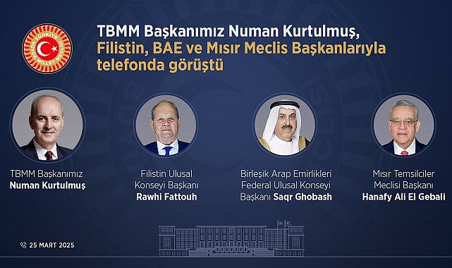TÜRKİYE Büyük Millet Meclisi (TBMM) Başkanı Numan Kurtulmuş, Filistin Ulusal Konseyi Başkanı Rawhi Fattouh, Birleşik Arap Emirlikleri (BAE) Federal Ulusal Konseyi Başkanı Saqr Ghobash ve Mısır Temsilciler Meclisi Başkanı Hanafy Ali El Gebali ile telefon görüşmesi gerçekleştirdi.TBMM'den yapılan açıklamaya göre; Meclis Başkanı Kurtulmuş, mevkidaşlarıyla görüşmesinde, 18 Nisan'da İstanbul'da düzenlenecek 'Filistin Dostu Parlamento Başkanları Grubu Toplantısı' için davetini şifahen de iletti. Kurtulmuş, görüşmelerinde ayrıca Filistin'de akan kanın durması, Gazze'nin yeniden imarı ve iki devletli çözüm temelinde bölgede kalıcı bir barışın sağlanması konularında ulusal parlamentolar olarak çabalarını ortaklaştırmaları gerektiğini belirtti.'ULUSLARARASI TOPLUM ORTAK HAREKET ETMELİ'Ateşkesin yeniden sağlanması ve Filistinlilere insani yardımların ulaştırılması için uluslararası toplumun ortak hareket etmesinin önemini vurgulayan TBMM Başkanı Kurtulmuş, Filistin dostlarının, her platformda güçlü bir Filistin vurgusu yaparak ve ellerindeki imkanları kullanarak bu alandaki mücadeleye destek vermesi arzusunda olduklarını söyledi. Kurtulmuş ayrıca Filistin Ulusal Konseyi Başkanı Fattouh, BAE Federal Ulusal Konseyi Başkanı Ghobash ile Mısır Temsilciler Meclisi Başkanı Gebali'nin yaklaşan Ramazan Bayramı'nı tebrik ederek, idrak edilecek Kadir Gecesi ve Ramazan Bayramı'nın, Filistin toprakları başta olmak üzere Müslüman coğrafyalarına huzur ve barış getirmesi temennisini dile getirdi.