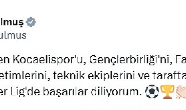 TÜRKİYE Büyük Millet Meclisi (TBMM) Başkanı Numan Kurtulmuş, Süper Lig'e yükselen Kocaelispor, Gençlerbirliği ve Fatih Karagümrük'ü yayımladığı mesajla tebrik etti.TBMM Başkanı Numan Kurtulmuş, sosyal medya hesabından paylaştığı mesajında, "Süper Lig'e yükselen Kocaelispor'u, Gençlerbirliği'ni, Fatih Karagümrük'ü; futbolcularını, yönetimlerini, teknik ekiplerini ve taraftarlarını kutluyor, takımlarımıza Süper Lig'de başarılar diliyorum" dedi.