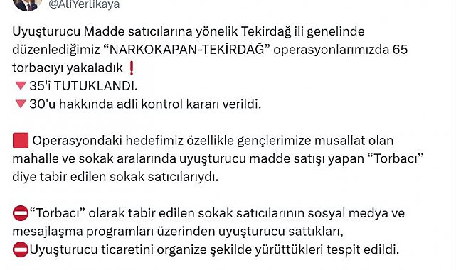 İÇİŞLERİ Bakanı Ali Yerlikaya, Tekirdağ'da düzenlenen uyuşturucu operasyonunda gözaltına alınan 65 şüpheliden 35'inin tutuklandığını, 30'u hakkında adli kontrol kararı verildiğini duyurdu.Bakan Yerlikaya, sosyal medya hesabından yaptığı açıklamada, "Tekirdağ, Çerkezköy ve Çorlu Cumhuriyet Başsavcılıkları ile Jandarma Genel Komutanlığı Narkotik Suçlarla Mücadele Daire Başkanlığı Analiz ve Takip Timleri dahil; 13 jandarma motorlu asayiş timi, 7 komando timi, 2 özel eğitimli narkotik köpeği, 320 jandarma personelinin katılımıyla Süleymanpaşa, Çerkezköy, Çorlu, Ergene, Hayrabolu ve Malkara'da operasyonlar gerçekleştirildi. Operasyondaki hedefimiz özellikle gençlerimize musallat olan mahalle ve sokak aralarında uyuşturucu madde satışı yapan 'Torbacı' diye tabir edilen sokak satıcılarıydı. 'Torbacı' olarak tabir edilen sokak satıcılarının sosyal medya ve mesajlaşma programları üzerinden uyuşturucu sattıkları, uyuşturucu ticaretini organize şekilde yürüttükleri tespit edildi. Operasyonumuzun hazırlıkları tam 3 ay sürdü. Bu 3 ay boyunca, adeta Tekirdağ'ın bir kez daha röntgenini çektik. Saha çalışmalarımızı ve analizlerimizi büyük bir titizlikle gerçekleştirdik. Şüphelileri teknik ve fiziki takiple izledik. İşlenen suçlara dair tüm faaliyetleri tek tek delillendirdik. Ve düğmeye bastık" dedi.'UYUŞTURUCU, İNSANLIĞIN EN BÜYÜK DÜŞMANIDIR'Tekirdağ ili genelinde düzenlenen 'Narkokapan-Tekirdağ' operasyonlarında 65 torbacının yakalandığını kaydeden Yerlikaya, "Bunlardan 35'i tutuklandı, 30'u hakkında adli kontrol kararı verildi. Tekirdağ Valimizi, cumhuriyet başsavcılıklarımızı, operasyonu gerçekleştiren Tekirdağ İl Jandarma Komutanımızı ve kahraman jandarmamızı tebrik ediyorum. Uyuşturucu, insanlığın en büyük düşmanıdır. Gençlerimizin hayatını çalmaya cüret eden, o zehir tacirleriyle ülkemiz ve insanlık adına mücadele etmeye devam edeceğiz" açıklamasında bulundu.