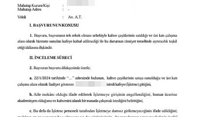 TÜRKİYE İnsan Hakları ve Eşitlik Kurumu (TİHEK) tarafından, erkek akademisyenin yanında kadın olmadığı için içeriye alınmadığı kafenin sahibine, cinsiyet temelinde ayrımcılık yasağını ihlal ettiği gerekçesiyle 204 bin 285 TL idari para cezası uygulandı. Akademisyen V.C.C., 22 Ocak 2024 tarihinde kahve çeşitlerinin satışa sunulduğu ve üst katı çalışma alanı olarak faaliyet gösteren kafeye gitti. V.C.C., aile konseptli bir işletme olduğu gerekçesiyle içeriye alınmadı. V.C.C., akademisyen olduğunu ve kahvesini alarak masada çalışmak istediğini belirtti. Ancak yanında kadın olmadığı için akademisyenin kafeye girişine izin verilmedi. V.C.C., konuyla ilgili Cumhurbaşkanlığı İletişim Merkezi'ne (CİMER) şikayette bulundu. Ardından belediye tarafından işletmeciye sözlü uyarıda bulunuldu. V.C.C., 18 Şubat 2025 tarihinde aynı kafeye ikinci defa gitti ve aynı uygulamanın devam ettiğini gördü.TİHEK'E BAŞVURDUV.C.C., tek erkek olması nedeniyle kafeye kabul edilmemesinin cinsiyet temelinde ayrımcılık teşkil ettiği iddiası ile TİHEK'e başvuruda bulundu. İşletme sahibi savunmasında, cadde üzerinde bulunan diğer işletmelerden alkollü şekilde gelip kafeye girmeye çalışan kişilerin diğer müşterileri rahatsız edeceğini, müşterilerin birbirinin huzurunu bozmadığı bir atmosfer sağlamaya çalıştıklarını ve bu nedenle işletme genelinde birtakım kısıtlamaların uygulandığını belirtti.TOPLUMSAL ÖN YARGI VURGUSUTİHEK kararında, erkeklerin içeride bulunan kadın müşterileri rahatsız edeceği yönündeki ön kabule ilişkin işletme sahibi tarafından somut veri veya objektif kanıt sunulmadığı belirtildi. İşletmede erkeklerin kadınları rahatsız ettiğine dair herhangi bir olgu veya olay ya da bu olaylar üzerine oluşturulmuş bir şikayet, tutanak gibi delilin sunulmadığı belirtildi. Erkeklerin kadınları rahatsız edeceğine dair düşüncenin de toplumsal ön yargılardan ileri geldiği, bunun gibi ön yargıların toplumdaki eşitsizliği derinleştirdiğine dikkat çekildi. İki kadın müşteri birlikte işletmeye kabul edilirken yalnızca ön yargılardan ve varsayımlardan hareketle tek ya da birden fazla erkek müşterinin işletmede aile konsepti uygulandığı gerekçesiyle yanında kadın olmadan alınmaması şeklindeki farklı muamele ile ulaşılmak istenen amacın meşru olmadığı vurgulandı. Bu amaç meşru sayılsa dahi ihtimal dahilinde olduğu ileri sürülen tatsız olaylara karşı güvenlik tedbirlerinin artırılması gibi alternatif ve ölçülü tedbirlerin değerlendirilmediğine işaret edildi. Bu şekilde bir uygulamanın somut olay adaleti açısından ölçülü olmadığının açık olduğu vurgulandı.Bu gerekçelerle söz konusu işletmeciye 6701 sayılı Sayılı Türkiye İnsan Hakları ve Eşitlik Kurumu Kanunu'nda yer alan cinsiyet temelinde ayrımcılık yasağını ihlal ettiği gerekçesiyle en üst sınırdan 204 bin 285 TL idari para cezası uygulanmasına karar verildi.
