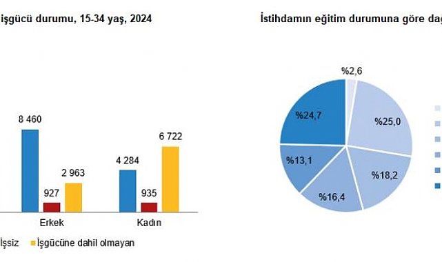 TÜRKİYE İstatistik Kurumu (TÜİK), iş gücü piyasasında 2024 yılında, 15-34 yaş grubunda istihdam oranının yüzde 52,5 olduğunu açıkladı.TÜİK, 'İşgücü Piyasasında Gençler 2024' adlı özel konulu araştırmanın sonuçlarını yayımladı. Buna göre; 2024 yılında 15-34 yaş grubunda kurumsal olmayan nüfus 24 milyon 291 bin kişi olup bu kişilerin 14 milyon 606 bini iş gücünde yer aldı. Bu yaş grubunda istihdam edilenlerin sayısı 12 milyon 744 bin kişiyken işsiz sayısı ise 1 milyon 862 bin kişi olarak gerçekleşti. 15-34 yaş grubunda iş gücüne katılma oranı yüzde 60,1, istihdam oranı yüzde 52,5 ve işsizlik oranı yüzde 12,7 olarak tahmin edildi. 15-34 yaş grubunda istihdamda olan gençlerin yüzde 25'i lise altı, yüzde 24,7'si 4 yıllık yükseköğretim ve üzeri eğitim seviyesine sahipken yüzde 18,2'si genel lise mezunlarından oluştu.STAJ VE ÇIRAKLIKTAKİ ÇALIŞMA DENEYİMİ YÜZDE 68,6 OLDUAraştırmada, lise ve üstü eğitimli gençler arasında eğitimi süresince eğitiminin bir parçası olarak (staj veya çıraklık gibi) en az 1 ay çalışma deneyimi olanların istihdam oranının yüzde 68,6 olduğu görüldü. Bu oran erkeklerde yüzde 82,2 iken, kadınlarda yüzde 54,8 olarak gerçekleşti. Çalışma deneyimi olmayan veya 1 aydan kısa süreli çalışma deneyimine sahip gençler için istihdam oranı yüzde 55,8 oldu. Eğitimini yarıda bırakan veya bölüm değiştiren gençlerin yüzde 22,5'i ekonomik nedenler, yüzde 17,2'si eğitim programının beklentisini karşılamaması, yüzde 14,1'i ailevi nedenlerden dolayı eğitimini yarıda bıraktığını veya bölüm değişikliği yaptığını beyan etti.EĞİTİM SEVİYESİYLE YAPILAN İŞİN UYUMLULUK ORANI YÜZDE 67,2İstihdamda olan gençlerin yüzde 67,2'si, eğitim seviyesiyle yaptıkları işin gereksinimlerinin uyumlu olduğunu beyan etti. Eğitim seviyesinin yaptığı işin gereksinimlerinden daha yüksek olduğunu beyan eden gençlerin oranı yüzde 25,4 iken, daha düşük olduğunu beyan edenlerin oranı ise yüzde 7,4 oldu. 4 yıllık yükseköğretim ve üzeri eğitime sahip gençlerin yüzde 74,7'si eğitim seviyesiyle yaptığı işin gereksinimlerinin uyumlu olduğunu belirtti. Mesleki veya teknik lise mezunlarında eğitim seviyesinin yaptığı işin gereksinimlerinden daha yüksek olduğunu belirtenlerin oranı yüzde 32,7 iken bu oran 2 veya 3 yıllık yüksekokul mezunlarında yüzde 34,6 oldu. Lise altı eğitim seviyesine sahip gençlerin yüzde 11,7'si ise eğitim seviyesinin yaptığı işin gereksinimlerinden daha düşük olduğunu belirtti.İstihdamda olan gençlerden, becerilerinin yaptığı işin gerekliliklerinden yüksek olduğunu beyan edenlerin oranı yüzde 27,1 iken, düşük olduğunu beyan edenlerin oranı ise yüzde 2,6 oldu. Becerileriyle yaptığı işin uyumlu olduğunu belirtenlerin oranı 4 yıllık yükseköğretim ve üzeri mezunlarda yüzde 77,7 iken; mesleki veya teknik lise mezunlarında bu oran yüzde 62,3 olarak gerçekleşti. Becerilerinin yaptığı işin gerekliliklerinden yüksek olduğunu beyan edenlerin oranı 4 yıllık yükseköğretim ve üzeri mezunlarda yüzde 20,8 iken; mesleki veya teknik lise mezunlarında yüzde 34 oldu.YÜZDE 15,7'Sİ İLK İŞİNE İLK 6 AY İÇİNDE BAŞLADIMevcut durumda eğitime devam etmeyen 15-34 yaş grubundaki gençlerin yüzde 15,7'si, 3 aydan uzun süreli ilk işine eğitimlerini tamamladıktan/yarım bıraktıktan sonra ilk 6 ay içinde başladığını belirtti. Bu oran erkeklerde yüzde 17,3, kadınlarda yüzde 14 oldu. Eğitiminden sonra, 3 aydan uzun süreli bir işte çalışmayan gençlerin oranı ise yüzde 21,7 olarak gerçekleşti. Bu oran erkeklerde yüzde 10,6, kadınlarda yüzde 33,9 olarak gerçekleşti.
