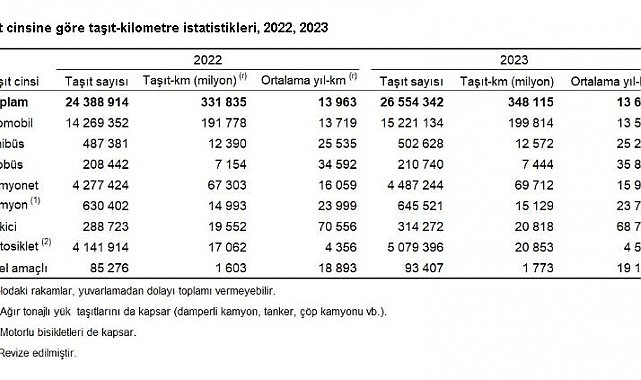 TÜRKİYE İstatistik Kurumu (TÜİK), 2023 yılında trafiğe kayıtlı motorlu kara taşıtları tarafından 348 milyar 115 milyon kilometre yol katedildiğini açıkladı.TÜİK, 2023 yılına ilişkin taşıt-kilometre istatistiklerini açıkladı. Buna göre; Türkiye'de 2023 yılında trafiğe kayıtlı motorlu kara taşıtları tarafından 348 milyar 115 milyon kilometre yol katedildi. Toplam kilometrenin yüzde 57,4'ü otomobiller, yüzde 20'si kamyonetler, yüzde 6'sı çekiciler, yüzde 6'sı motosikletler, yüzde 4,4'ü kamyonlar, yüzde 3,6'sı minibüsler, yüzde 2,1'i otobüsler ve yüzde 0,5'i özel amaçlı taşıtlar tarafından yapıldı.Türkiye'de 2023 yılında trafiğe kayıtlı toplam motorlu kara taşıtları sayısı bir önceki yıla göre yüzde 8,9 artarken toplam taşıt kilometresi yüzde 4,9 artış gösterdi. Taşıt sayısı; motosikletlerde yüzde 22,6, özel amaçlı taşıtlarda yüzde 9,5, çekicilerde yüzde 8,8, otomobillerde yüzde 6,7, kamyonetlerde yüzde 4,9, minibüslerde yüzde 3,1, kamyonlarda yüzde 2,4, otobüslerde yüzde 1,1 artış gösterirken, taşıt kilometresi motosikletlerde yüzde 22,2, özel amaçlı taşıtlarda yüzde 10,6, çekicilerde yüzde 6,5, otomobillerde yüzde 4,2, otobüslerde yüzde 4,1, kamyonetlerde yüzde 3,6, minibüslerde yüzde 1,5 ve kamyonlarda yüzde 0,9 arttı.OTOMOBİLLER YILDA ORTALAMA 13 BİN 564 KİLOMETRE YAPTITaşıtların 1 yılda yaptıkları ortalama kilometreler incelendiğinde; 2023 yılında sırasıyla çekicilerin 68 bin 785, otobüslerin 35 bin 808, minibüslerin 25 bin 268, kamyonların 23 bin 704, özel amaçlı taşıtların 19 bin 142, kamyonetlerin 15 bin 928, otomobillerin 13 bin 564 ve motosikletlerin 4 bin 554 kilometre yaptığı hesaplandı.Otomobiller tarafından 2023 yılında katedilen mesafe taşıtların yakıt türlerine göre incelendiğinde; toplam kilometrenin yüzde 42'si dizel, yüzde 30,8'i LPG'li, yüzde 25,1'i benzinli, yüzde 1,8'i hibrit ve yüzde 0,3'ü elektrikli otomobiller tarafından yapıldı.EN FAZLA MESAFEYİ 5-9 YAŞ GRUBU TAŞITLAR KATETTİTürkiye'de 2023 yılında katedilen toplam mesafe taşıtların yaş gruplarına göre incelendiğinde; en fazla yol yüzde 24,6'lık oranla taşıt filosunun yüzde 19,8'ini oluşturan 5-9 yaş grubu taşıtlar tarafından yapılırken, bunu sırasıyla yüzde 19,5 ile 10-14 yaş, yüzde 14,0 ile 2-4 yaş, yüzde 13,6 ile 15-19 yaş, yüzde 12,1 ile 25 yaş ve üzeri, yüzde 10,5 ile 0-1 yaş ve yüzde 5,7 ile 20-24 yaş grubu taşıtlar takip etti. Bu oran otomobillerde 5-9 yaş otomobiller için yüzde 25,7, 10-14 yaş için yüzde 18,3, 2-4 yaş için yüzde 14,7, 25 yaş ve üzeri için yüzde 14,5, 14-19 yaş için yüzde 11,1, 0-1 yaş için yüzde 9,3 ve 20-24 yaş için ise yüzde 6,4 oldu.