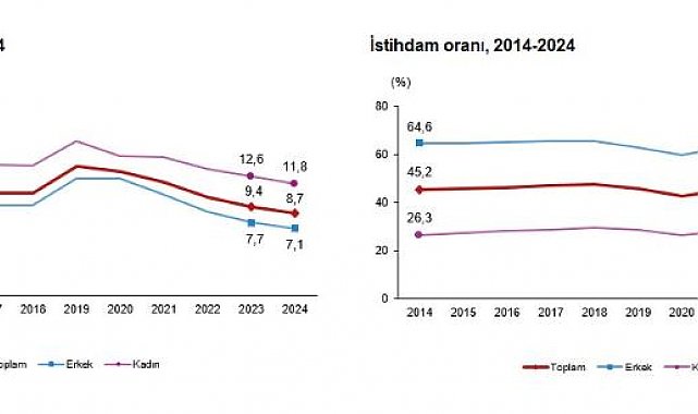 TÜRKİYE İstatistik Kurumu (TÜİK), 2024 yılında işsizlik oranının bir önceki yıla göre 0,7 puan azalarak yüzde 8,7 seviyesinde gerçekleştiğini açıkladı. TÜİK, 2024 yılı iş gücü istatistiklerini açıkladı. Buna göre; 15 ve daha yukarı yaştaki kişilerde işsiz sayısı, 2024 yılında bir önceki yıla göre 151 bin kişi azalarak 3 milyon 113 bin kişi oldu. İşsizlik oranı 0,7 puan azalarak yüzde 8,7 seviyesinde gerçekleşti. İşsizlik oranı, erkeklerde yüzde 7,1 iken, kadınlarda yüzde 11,8 olarak gerçekleşti. İstihdam edilenlerin sayısı, 2024 yılında bir önceki yıla göre 988 bin kişi artarak 32 milyon 620 bin kişi, istihdam oranı ise 1,2 puan artarak yüzde 49,5 oldu. Bu oran erkeklerde yüzde 66,9 iken, kadınlarda yüzde 32,5 olarak gerçekleşti. İş gücü 2024 yılında bir önceki yıla göre 837 bin kişi artarak 35 milyon 733 bin kişi, iş gücüne katılma oranı ise 0,9 puan artarak yüzde 54,2 olarak gerçekleşti. İş gücüne katılma oranı erkeklerde yüzde 72, kadınlarda ise yüzde 36,8 oldu.GENÇ NÜFUSTA İŞSİZLİK ORANI YÜZDE 16,315-24 yaş grubunu kapsayan genç nüfusta işsizlik oranı, 2024 yılında bir önceki yıla göre 1,1 puan azalarak yüzde 16,3 oldu. Bu yaş grubunda işsizlik oranı, erkeklerde yüzde 13,1, kadınlarda ise yüzde 22,3 olarak gerçekleşti.İSTİHDAMIN YÜZDE 57,9'U HİZMET SEKTÖRÜNDE YER ALDIİstihdam edilenlerin yüzde 14,8'i tarım, yüzde 20,7'si sanayi, yüzde 6,6'sı inşaat, yüzde 57,9'u ise hizmet sektöründe yer aldı. Bir önceki yıl ile karşılaştırıldığında hizmet ve inşaat sektörlerinin istihdam edilenler içindeki payı 0,3 puan artarken, sanayi sektörünün payı 0,5 puan azaldı, tarım sektörünün payı ise değişim göstermedi.2024 yılında 4 milyon 827 bin kişi tarım sektöründe, 6 milyon 746 bin kişi sanayi sektöründe, 2 milyon 162 bin kişi inşaat sektöründe, 18 milyon 886 bin kişi hizmet sektöründe istihdam edildi. Bir önceki yıl ile karşılaştırıldığında istihdam edilenlerin sayısı tarım sektöründe 132 bin, sanayi sektöründe 35 bin, inşaat sektöründe 165 bin, hizmet sektöründe 656 bin kişi arttı.ATIL İŞ GÜCÜ ORANI YÜZDE 26,7 OLDUZamana bağlı eksik istihdam, potansiyel iş gücü ve işsizlerden oluşan atıl iş gücü oranı, 2024 yılında bir önceki yıla göre 3,9 puan artarak yüzde 26,7 oldu. Zamana bağlı eksik istihdam ve işsizlerin bütünleşik oranı yüzde 18,1 iken, işsiz ve potansiyel iş gücünün bütünleşik oranı yüzde 18,4 olarak gerçekleşti.EN DÜŞÜK İŞSİZLİK ORANINA SAHİP İLLER BURDUR VE KASTAMONU İşsizlik oranı en düşük iller, yüzde 4 ile Burdur ve Kastamonu iken, işsizlik oranı en yüksek il yüzde 18,3 ile Hakkari oldu. En yüksek istihdam oranı yüzde 60,6 ile Ardahan'da gerçekleşti. En düşük istihdam oranı ise yüzde 35,3 ile Hakkari'de oldu. En yüksek iş gücüne katılma oranı yüzde 63,9 ile Ardahan'da gerçekleşti. En düşük iş gücüne katılma oranı ise yüzde 41,6 ile Siirt'te oldu.