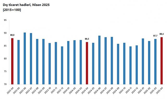 TÜRKİYE İstatistik Kurumu (TÜİK), nisan ayında dış ticaret haddinin bir önceki yılın aynı ayına göre 1,9 puan artarak 88,4 olduğunu açıkladı. TÜİK, Nisan 2025 dönemine ilişkin dış ticaret endekslerini açıkladı. Buna göre; ihracat birim değer endeksi nisan ayında bir önceki yılın aynı ayına göre yüzde 3,3 arttı. Endeks, bir önceki yılın aynı ayına göre gıda, içecek ve tütünde yüzde 11 arttı, ham maddelerde (yakıt hariç) yüzde 5,1 arttı, yakıtlarda yüzde 17,6 azaldı, imalat sanayinde (gıda, içecek, tütün hariç) yüzde 3,7 arttı. İhracat miktar endeksi nisan ayında bir önceki yılın aynı ayına göre yüzde 4,4 arttı. Endeks, bir önceki yılın aynı ayına göre gıda, içecek ve tütünde yüzde 4,7 azaldı, ham maddelerde (yakıt hariç) yüzde 0,9 azaldı, yakıtlarda yüzde 0,6 arttı, imalat sanayinde (gıda, içecek, tütün hariç) yüzde 8,3 arttı.İTHALAT BİRİM DEĞER ENDEKSİ YÜZDE 1,1 ARTTIİthalat birim değer endeksi nisan ayında bir önceki yılın aynı ayına göre yüzde 1,1 arttı. Endeks, bir önceki yılın aynı ayına göre, gıda, içecek ve tütünde yüzde 22,3 arttı, yakıtlarda yüzde 11,3 azaldı, ham maddelerde (yakıt hariç) yüzde 1,8 azaldı, imalat sanayinde (gıda, içecek, tütün hariç) yüzde 1,5 arttı. İthalat miktar endeksi nisan ayında bir önceki yılın aynı ayına göre yüzde 11,5 arttı. Endeks, bir önceki yılın aynı ayına göre, gıda, içecek ve tütünde yüzde 9,1 arttı, ham maddelerde (yakıt hariç) yüzde 13,7 arttı, yakıtlarda yüzde 9,1 arttı, imalat sanayinde (gıda, içecek, tütün hariç) yüzde 10,7 arttı. İhracat birim değer endeksinin ithalat birim değer endeksine bölünmesiyle hesaplanan dış ticaret haddi, bir önceki yılın aynı ayına göre 1,9 puan artarak, 2025 yılı Nisan ayında 88,4 oldu.