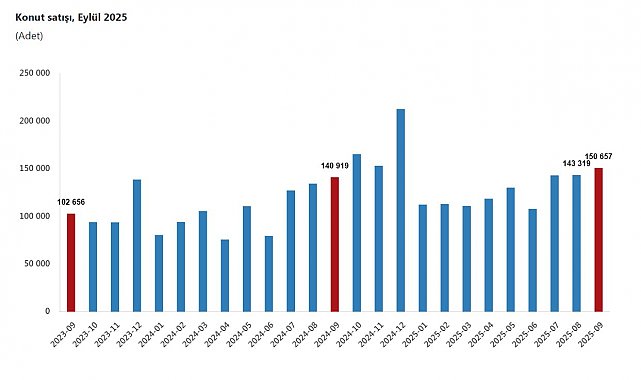 TÜRKİYE İstatistik Kurumu (TÜİK), Türkiye genelinde konut satışlarının eylül ayında bir önceki yılın aynı ayına göre yüzde 6,9 oranında artarak 150 bin 657 olduğunu açıkladı.TÜİK, Eylül 2025 dönemine ilişkin konut satış istatistiklerini açıkladı. Buna göre; Türkiye genelinde konut satışları eylül ayında bir önceki yılın aynı ayına göre yüzde 6,9 oranında artarak 150 bin 657 oldu. Konut satış sayısının en fazla olduğu iller sırasıyla 24 bin 119 ile İstanbul, 13 bin 417 ile Ankara ve 8 bin 544 ile İzmir olurken, en az olduğu iller sırasıyla 70 ile Ardahan, 117 ile Bayburt ve 142 ile Tunceli olarak gerçekleşti. Konut satışları ocak- eylül döneminde bir önceki yılın aynı dönemine göre yüzde 19,2 oranında artarak 1 milyon 128 bin 727 olarak gerçekleşti.İPOTEKLİ KONUT SATIŞLARI YÜZDE 34,4 ARTTITürkiye genelinde ipotekli konut satışları eylül ayında bir önceki yılın aynı ayına göre yüzde 34,4 oranında artarak 21 bin 266 oldu. Toplam konut satışları içinde ipotekli satışların payı yüzde 14,1 olarak gerçekleşti. Ocak- eylül döneminde gerçekleşen ipotekli konut satışları ise bir önceki yılın aynı dönemine göre yüzde 76 oranında artarak 162 bin 493 oldu. Eylül ayında 4 bin 978; Ocak-eylül döneminde ise 38 bin 571 ipotekli konut satışı, ilk el olarak gerçekleşti.Türkiye genelinde diğer konut satışları eylül ayında bir önceki yılın aynı ayına göre yüzde 3,4 oranında artarak 129 bin 391 oldu. Toplam konut satışları içinde diğer satışların payı yüzde 85,9 olarak gerçekleşti. Ocak-eylül döneminde gerçekleşen diğer konut satışları ise bir önceki yılın aynı dönemine göre yüzde 13 oranında artarak 966 bin 234 oldu.İLK EL KONUT SATIŞ SAYISI 47 BİN 117 OLDUTürkiye genelinde ilk el konut satış sayısı eylül ayında bir önceki yılın aynı ayına göre yüzde 5 oranında artarak 47 bin 117 oldu. Toplam konut satışları içinde ilk el konut satışının payı yüzde 31,3 oldu. İlk el konut satışları ocak-eylül döneminde ise bir önceki yılın aynı dönemine göre yüzde 13,9 oranında artarak 342 bin 641 olarak gerçekleşti.Türkiye genelinde ikinci el konut satış sayısı eylül ayında bir önceki yılın aynı ayına göre yüzde 7,8 oranında artarak 103 bin 540 oldu. Toplam konut satışları içinde ikinci el konut satışının payı yüzde 68,7 oldu. İkinci el konut satışları ocak-eylül döneminde ise bir önceki yılın aynı dönemine göre yüzde 21,6 oranında artarak 786 bin 86 olarak gerçekleşti.YABANCILARA KONUT SATIŞI AZALDIYabancılara yapılan konut satışları eylül ayında bir önceki yılın aynı ayına göre yüzde 7,7 oranında azalarak 1867 oldu. Eylül ayında toplam konut satışları içinde yabancılara yapılan konut satışının payı yüzde 1,2 olarak gerçekleşti. Yabancılara yapılan konut satış sayısının en fazla olduğu iller sırasıyla 744 ile İstanbul, 557 ile Antalya ve 124 ile Mersin oldu. Yabancılara yapılan konut satışları ocak-eylül döneminde bir önceki yılın aynı dönemine göre yüzde 12,6 oranında azalarak 14 bin 944 oldu. Eylül ayında ülke uyruklarına göre en fazla konut satışı sırasıyla 267 ile Rusya Federasyonu, 202 ile İran ve 146 ile Irak vatandaşlarına yapıldı.