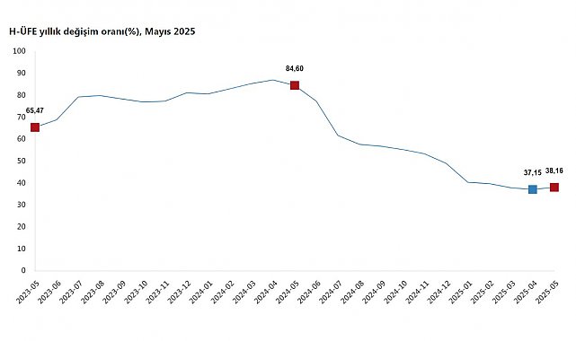 TÜRKİYE İstatistik Kurumu (TÜİK), Hizmet Üretici Fiyat Endeksi'nin (H-ÜFE) yıllık yüzde 38,16, aylık yüzde 2,37 arttığını açıkladı. TÜİK, H-ÜFE Mayıs 2025 verilerini açıkladı. Buna göre, H-ÜFE, 2025 yılı mayıs ayında bir önceki aya göre yüzde 2,37 artış, bir önceki yılın aralık ayına göre yüzde 21,42 artış, bir önceki yılın aynı ayına göre yüzde 38,16 artış ve 12 aylık ortalamalara göre yüzde 48,65 artış gösterdi. ULAŞTIRMA VE DEPOLAMA HİZMETLERİNDE YILLIK YÜZDE 31,33 ARTIŞ Bir önceki yılın aynı ayına göre, ulaştırma ve depolama hizmetlerinde yüzde 31,33 artış, konaklama ve yiyecek hizmetlerinde yüzde 38,38 artış, bilgi ve iletişim hizmetlerinde yüzde 46,69 artış, gayrimenkul hizmetlerinde yüzde 43,04 artış, mesleki, bilimsel ve teknik hizmetlerde yüzde 48,69 artış, idari ve destek hizmetlerde yüzde 43,68 artış gerçekleşti. AYLIK YÜZDE 1,33 ARTIŞ YAŞANDIBir önceki aya göre, ulaştırma ve depolama hizmetlerinde yüzde 1,33 artış, konaklama ve yiyecek hizmetlerinde yüzde 4,13 artış, bilgi ve iletişim hizmetlerinde yüzde 1,02 artış, gayrimenkul hizmetlerinde yüzde 7,41 artış, mesleki, bilimsel ve teknik hizmetlerde yüzde 1,12 artış, idari ve destek hizmetlerde yüzde 3,80 artış gerçekleşti.