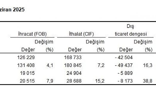 TÜRKİYE İstatistik Kurumu (TÜİK), haziran ayında ihracatın bir önceki yılın aynı ayına göre yüzde 7,9 artarak 20 milyar 515 milyon dolar, ithalatın yüzde 15,2 artarak 28 milyar 688 milyon dolar olarak gerçekleştiğini açıkladı.TÜİK, Haziran 2025 dönemine ilişkin dış ticaret istatistiklerini açıkladı. Buna göre; ihracat 2025 yılı Haziran ayında, bir önceki yılın aynı ayına göre yüzde 7,9 artarak 20 milyar 515 milyon dolar, ithalat yüzde 15,2 artarak 28 milyar 688 milyon dolar olarak gerçekleşti. İhracat 2025 yılı Ocak-Haziran döneminde bir önceki yılın aynı dönemine göre yüzde 4,1 artarak 131 milyar 408 milyon dolar, ithalat yüzde 7,2 artarak 180 milyar 845 milyon dolar olarak gerçekleşti.DIŞ TİCARET AÇIĞI YÜZDE 38,8 ARTTIHaziran ayında dış ticaret açığı bir önceki yılın aynı ayına göre yüzde 38,8 artarak 5 milyar 889 milyon dolardan, 8 milyar 173 milyon dolara yükseldi. İhracatın ithalatı karşılama oranı 2024 Haziran ayında yüzde 76,4 iken, 2025 Haziran ayında yüzde 71,5 oldu. Ocak-haziran döneminde de dış ticaret açığı yüzde 16,3 artarak 42 milyar 504 milyon dolardan, 49 milyar 437 milyon dolara yükseldi. İhracatın ithalatı karşılama oranı 2024 Ocak-Haziran döneminde yüzde 74,8 iken, 2025 yılının aynı döneminde yüzde 72,7'ye geriledi.EN FAZLA İHRACAT YAPILAN ÜLKE ALMANYA Haziran ayında ihracatta ilk sırayı Almanya aldı. Almanya'ya yapılan ihracat 1 milyar 728 milyon dolar olurken, bu ülkeyi sırasıyla; 1 milyar 266 milyon dolar ile Birleşik Krallık, 1 milyar 197 milyon dolar ile ABD, 1 milyar 70 milyon dolar ile İtalya, 890 milyon dolar ile Fransa takip etti. İlk 5 ülkeye yapılan ihracat, toplam ihracatın yüzde 30'unu oluşturdu.Ocak-haziran döneminde de ihracatta ilk sırayı Almanya aldı. Almanya'ya yapılan ihracat 10 milyar 915 milyon dolar olurken, bu ülkeyi sırasıyla; 8 milyar 164 milyon dolar ile Birleşik Krallık, 7 milyar 837 milyon dolar ile ABD, 6 milyar 662 milyon dolar ile İtalya ve 5 milyar 636 milyon dolar ile Irak takip etti. İlk 5 ülkeye yapılan ihracat, toplam ihracatın yüzde 29,8'ini oluşturdu. İTHALATTA İLK SIRAYI ÇİN ALDIİthalatta Çin ilk sırayı aldı. Haziran ayında Çin'den yapılan ithalat 3 milyar 831 milyon dolar olurken, bu ülkeyi sırasıyla; 3 milyar 316 milyon dolar ile Rusya Federasyonu, 2 milyar 698 milyon dolar ile Almanya, 1 milyar 468 milyon dolar ile ABD, 1 milyar 117 milyon dolar ile İsviçre izledi. İlk 5 ülkeden yapılan ithalat, toplam ithalatın yüzde 43,3'ünü oluşturdu.Ocak-haziran döneminde ithalatta ilk sırayı Çin aldı. Çin'den yapılan ithalat 23 milyar 956 milyon dolar olurken, bu ülkeyi sırasıyla; 21 milyar 705 milyon dolar ile Rusya Federasyonu, 14 milyar 642 milyon dolar ile Almanya, 8 milyar 259 milyon dolar ile ABD, 7 milyar 984 milyon dolar ile İtalya izledi. İlk 5 ülkeden yapılan ithalat, toplam ithalatın yüzde 42,3'ünü oluşturdu.
