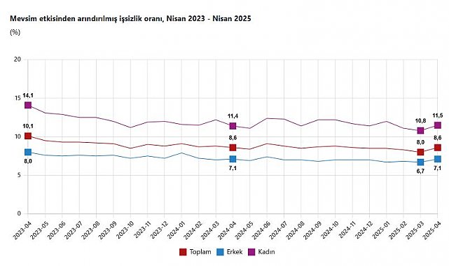 TÜİK, Nisan 2025 dönemine ilişkin iş gücü istatistiklerini açıkladı. Buna göre; 15 ve daha yukarı yaştaki kişilerde işsiz sayısı bir önceki aya göre 203 bin kişi artarak 3 milyon 63 bin kişi oldu. İşsizlik oranı ise 0,6 puan artarak yüzde 8,6 seviyesinde gerçekleşti. İşsizlik oranı erkeklerde yüzde 7,1 iken kadınlarda yüzde 11,5 oldu. İstihdam edilenlerin sayısı, bir önceki aya göre 316 bin kişi azalarak 32 milyon 359 bin kişi, istihdam oranı 0,5 puan azalarak yüzde 48,8 oldu. Bu oran erkeklerde yüzde 65,8 iken kadınlarda yüzde 32,2 olarak gerçekleşti. İş gücü, bir önceki aya göre 114 bin kişi azalarak 35 milyon 421 bin kişi, iş gücüne katılma oranı ise 0,2 puan azalarak yüzde 53,4 olarak gerçekleşti. İş gücüne katılma oranı erkeklerde yüzde 70,9 iken kadınlarda yüzde 36,4 oldu.