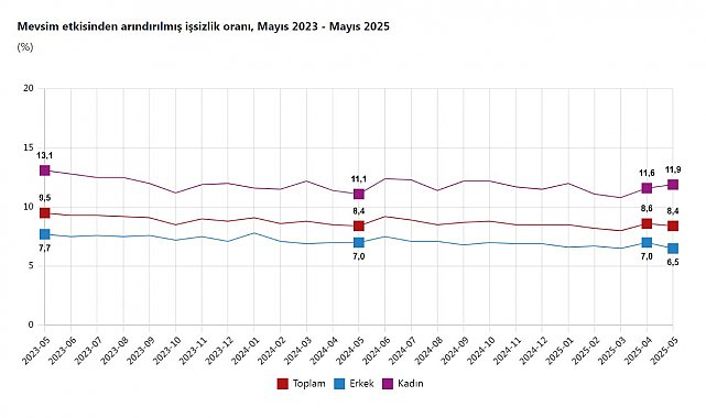 TÜRKİYE İstatistik Kurumu (TÜİK), mayıs ayında işsizlik oranının aylık 0,2 puan azalarak yüzde 8,4 seviyesinde gerçekleştiğini açıkladı.TÜİK, Mayıs 2025 dönemine ilişkin iş gücü istatistiklerini açıkladı. Buna göre; 15 ve daha yukarı yaştaki kişilerde işsiz sayısı bir önceki aya göre 69 bin kişi azalarak 2 milyon 972 bin kişi oldu. İşsizlik oranı 0,2 puan azalarak yüzde 8,4 seviyesinde gerçekleşti. İşsizlik oranı erkeklerde yüzde 6,5 iken kadınlarda yüzde 11,9 olarak tahmin edildi. İstihdam edilenlerin sayısı, bir önceki aya göre 100 bin kişi artarak 32 milyon 519 bin kişi, istihdam oranı 0,1 puan artarak yüzde 49 oldu. Bu oran erkeklerde yüzde 66,3 iken kadınlarda yüzde 32,2 olarak gerçekleşti. İş gücü, bir önceki aya göre 31 bin kişi artarak 35 milyon 491 bin kişi, iş gücüne katılma oranı aynı seviyede kalarak yüzde 53,5 olarak gerçekleşti. İş gücüne katılma oranı erkeklerde yüzde 70,9 iken kadınlarda yüzde 36,5 oldu.GENÇ NÜFUSTA İŞSİZLİK ORANI YÜZDE 15,415-24 yaş grubunu kapsayan genç nüfusta işsizlik oranı bir önceki aya göre 0,3 puan azalarak yüzde 15,4 oldu. Bu yaş grubunda işsizlik oranı; erkeklerde yüzde 11, kadınlarda ise yüzde 23,5 olarak tahmin edildi.İstihdam edilenlerden referans döneminde işbaşında olanların, mevsim ve takvim etkilerinden arındırılmış haftalık ortalama fiili çalışma süresi bir önceki aya göre 0,6 saat artarak 42,7 saat olarak gerçekleşti.Zamana bağlı eksik istihdam, potansiyel iş gücü ve işsizlerden oluşan atıl iş gücü oranı da bir önceki aya göre 1,1 puan azalarak yüzde 31 oldu. Zamana bağlı eksik istihdam ve işsizlerin bütünleşik oranı yüzde 20,7 iken işsiz ve potansiyel iş gücünün bütünleşik oranı yüzde 20,2 olarak tahmin edildi.