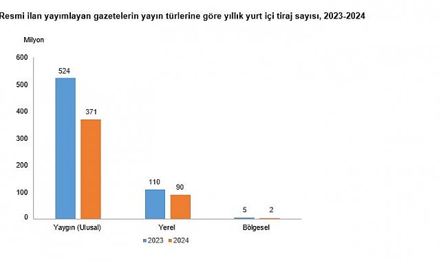 TÜRKİYE İstatistik Kurumu (TÜİK), 2024 yılında resmi ilan yayımlayan gazete sayısının bir önceki yıla göre yüzde 11,9 azalarak 753 olduğunu açıkladı.TÜİK, 2024 yılına ilişkin süreli yayın istatistiklerini açıkladı. Buna göre; 2024 yılında resmi ilan yayımlayan gazete sayısı bir önceki yıla göre yüzde 11,9 azalarak 753 oldu. Bu yayınların yüzde 95,9'unu yerel, yüzde 3,1'ini yaygın (ulusal), yüzde 1,1'ini ise bölgesel yayınlar oluşturdu. 2024 yılında resmi ilan yayımlayan gazetelerin yıllık toplam tirajı ise 2023 yılına göre yüzde 27,5 azalarak 462 milyon 707 bin 383 oldu. Tirajın yüzde 80,1'ini yaygın (ulusal) gazeteler oluşturdu.RESMİ İLAN YAYIMLAYAN İNTERNET HABER SİTELERİNİN SAYISI 349 OLDU2024 yılında resmi ilan yayımlayan internet haber sitesi sayısı 349 oldu. Toplam tekil ziyaretçi sayısı 9 milyar 292 milyon 640 bin 555 olarak gerçekleşti. Bu ziyaretçi trafiğinin yüzde 56,1'i genel kategoride bulunan internet haber sitelerinden oluştu. Toplam sayfa görüntüleme sayısı 46 milyar 714 milyon 549 bin 465 olarak gerçekleşti. Bu görüntüleme sayısının yüzde 68,6'sı genel kategoride bulunan internet haber sitelerinden oldu.RESMİ REKLAM YAYIMLAYAN DERGİLERİN YÜZDE 51,9'U AYLIK YAYIMLANDIResmi reklam yayımlayan dergilerin yüzde 51,9'u aylık, yüzde 13,5'i iki aylık, yüzde 12,4'ü haftalık, yüzde 9,7'si üç aylık, yüzde 9,1'i 15 günlük ve yüzde 3,4'ü günlük olarak yayımlandı. Resmi ilan yayımlayan gazetelerin ise yüzde 60,6'sı günlük, yüzde 39,4'ü haftada 2-6 gün arası olarak yayımlandı. Bu yayınların toplam tirajının yüzde 99,6'sını günlük, yüzde 0,4'ünü haftada 2-6 gün arası yayımlananlar oluşturdu.Toplam 2 bin 40 süreli yayının yüzde 88,8'i siyasi/haber/güncel, yüzde 4,2'si sektörel/mesleki, yüzde 2,3'ü kültür/turizm/tanıtım, yüzde 1,6'sı ekonomi/ticaret/finans içerikli yayımlanırken, yüzde 3,1'i ise diğer içerik türlerinde yayımlandı. RESMİ İLAN YAYIMLAYAN GAZETELERDE ÇALIŞANLARIN SAYISI 4 BİN 315 OLDU2024 yılında resmi ilan yayımlayan gazetelerde çalışanların yüzde 37,8'i lise ve dengi okul, yüzde 34'ü lisans, yüzde 14'ü lise altı, yüzde 11,9'u ön lisans, yüzde 2,2'si ise yüksek lisans/doktora mezunlarından oluştu. Resmi ilan yayımlayan gazetelerde çalışanların ünvanlarına göre ise yüzde 44,5'i muhabir, yüzde 26,5'i sayfa sekreteri, yüzde 19,4'ü sorumlu müdür, yüzde 7,4'ü yazar ve yüzde 2,1'i haber müdürü olarak görev yaptı.2024 yılında resmi ilan yayımlayan internet haber sitelerinde çalışanların yüzde 56,3'ü lisans, yüzde 25'i lise ve dengi okul, yüzde 10,4'ü ön lisans, yüzde 5,3'ü lise altı, yüzde 3,1'i ise yüksek lisans/doktora mezunlarından oluştu. Resmi ilan yayımlayan internet haber sitelerinde çalışanların unvanlarına göre ise yüzde 39,7'si muhabir, yüzde 36,3'ü internet editörü, yüzde 11'i sorumlu müdür, yüzde 9,5'i yazar ve yüzde 3,4'ü haber müdürü olarak görev yaptı.