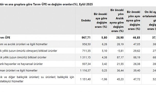 TÜRKİYE İstatistik Kurumu (TÜİK), tarım ürünleri üretici fiyatlarının eylülde yıllık yüzde 46,83, aylık yüzde 5,80 arttığını açıkladı.TÜİK, Eylül 2025 dönemine ilişkin tarım ürünleri üretici fiyat endeksi verilerini açıkladı. Buna göre; tarım ürünleri üretici fiyatları bir önceki aya göre yüzde 5,80, bir önceki yılın aralık ayına göre yüzde 28,90, bir önceki yılın aynı ayına göre yüzde 46,83 ve 12 aylık ortalamalara göre yüzde 37,98 arttı.Sektörlerde bir önceki aya göre, tarım ve avcılık ürünleri ve ilgili hizmetlerde yüzde 6,28 artış, ormancılık ürünleri ve ilgili hizmetlerde yüzde 0,25 artış ve balık ve diğer balıkçılık ürünleri, su ürünleri; balıkçılık için destekleyici hizmetlerde yüzde 1,96 azalış gerçekleşti. Ana gruplarda bir önceki aya göre, tek yıllık (uzun ömürlü olmayan) bitkisel ürünlerde yüzde 5,10 artış, çok yıllık (uzun ömürlü) bitkisel ürünlerde yüzde 4,38 artış ve canlı hayvanlar ve hayvansal ürünlerde yüzde 3,42 artış gerçekleşti. Yıllık değişimin en yüksek olduğu alt grup yüzde 155,54 artış ile yumuşak çekirdekli meyveler ve sert çekirdekli meyveler, aylık değişimin en yüksek olduğu alt grup yüzde 19,63 artış ile diğer ağaç ve çalı meyveleri ile sert kabuklu meyveler oldu.