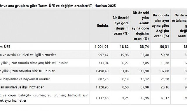 TÜİK, Haziran 2025 dönemine ilişkin tarım ürünleri üretici fiyat endeksi verilerini açıkladı. Buna göre; tarım ürünleri üretici fiyatlarında haziran ayında bir önceki aya göre yüzde 18,82, bir önceki yılın aralık ayına göre yüzde 33,74, bir önceki yılın aynı ayına göre yüzde 50,31 ve 12 aylık ortalamalara göre yüzde 35,46 artış gerçekleşti. Sektörlerde bir önceki aya göre, tarım ve avcılık ürünleri ve ilgili hizmetlerde yüzde 19,98, ormancılık ürünleri ve ilgili hizmetlerde yüzde 0,50, balık ve diğer balıkçılık ürünleri; su ürünleri; balıkçılık için destekleyici hizmetlerde yüzde 5,25 artış gerçekleşti. Ana gruplarda bir önceki aya göre, tek yıllık (uzun ömürlü olmayan) bitkisel ürünlerde yüzde 0,22 artış, çok yıllık (uzun ömürlü) bitkisel ürünlerde yüzde 51,08 artış ve canlı hayvanlar ve hayvansal ürünlerde yüzde 0,19 azalış gerçekleşti. Yıllık değişimin en yüksek olduğu alt grup yüzde 202,59 artış ile yumuşak çekirdekli meyveler ve sert çekirdekli meyveler, aylık değişimin en yüksek olduğu alt grup yüzde 47,92 artış ile yumuşak çekirdekli meyveler ve sert çekirdekli meyveler oldu.