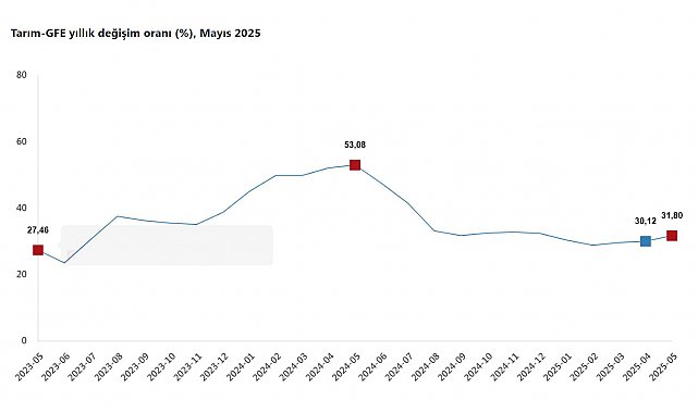 TÜRKİYE İstatistik Kurumu (TÜİK), tarımsal girdi fiyatlarının mayıs ayında yıllık yüzde 31,80, aylık yüzde 2,15 arttığını açıkladı.TÜİK, Mayıs 2025 dönemine ilişkin tarımsal girdi fiyat endeksi verilerini açıkladı. Buna göre; tarımsal girdi fiyatları bir önceki aya göre yüzde 2,15, bir önceki yılın aralık ayına göre yüzde 14,99, bir önceki yılın aynı ayına göre yüzde 31,80 ve 12 aylık ortalamalara göre yüzde 33,11 arttı. Ana gruplarda bir önceki aya göre, tarımda kullanılan mal ve hizmetler endeksinde yüzde 1,74 artış, tarımsal yatırıma katkı sağlayan mal ve hizmetler endeksinde yüzde 4,59 artış gerçekleşti. Bir önceki yılın aynı ayına göre tarımda kullanılan mal ve hizmetler endeksinde yüzde 31,08 artış, tarımsal yatırıma katkı sağlayan mal ve hizmetler endeksinde yüzde 36,12 artış gerçekleşti. Yıllık değişimin en yüksek olduğu alt grup yüzde 55,83 artış ile veteriner harcamaları, aylık değişimin en yüksek olduğu alt grup yüzde 5,10 artış ile malzemeler oldu.