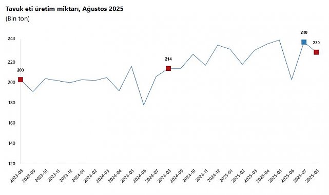 TÜRKİYE İstatistik Kurumu (TÜİK), ağustosta aylık tavuk eti üretiminin azaldığını, yumurta ve içme sütü üretiminin arttığını açıkladı. TÜİK, Ağustos 2025 dönemine ilişkin kümes hayvancılığı ile süt ve süt ürünleri üretimi istatistiklerini açıkladı. Buna göre; bir önceki ay 239 bin 876 ton olan tavuk eti üretimi ağustos ayında yüzde 4,1 oranında azalarak 229 bin 965 ton oldu. Bir önceki ay 1 milyar 623 milyon 487 bin adet olan tavuk yumurtası üretimi ağustos ayında yüzde 3,4 oranında artarak 1 milyar 679 milyon 277 bin adet oldu. Ağustos ayında bir önceki yılın aynı ayına göre, tavuk yumurtası üretimi yüzde 7,1 azaldı, kesilen tavuk sayısı yüzde 6,7 arttı, tavuk eti üretimi yüzde 7,2 arttı. Ocak-ağustos döneminde ise bir önceki yılın aynı dönemine göre, tavuk yumurtası üretimi yüzde 9,3 azaldı, kesilen tavuk sayısı yüzde 10,8 arttı, tavuk eti üretimi yüzde 13,5 arttı.933 BİN 234 TON İNEK SÜTÜ TOPLANDIBir önceki ay 946 bin 158 ton olan ticari süt işletmeleri tarafından toplanan inek sütü miktarı ağustos ayında yüzde 1,4 oranında azalarak 933 bin 234 ton oldu. Bir önceki ay 127 bin 164 ton olan içme sütü üretimi ağustos ayında yüzde 4,1 oranında artarak 132 bin 359 ton olarak gerçekleşti.Ticari süt işletmeleri tarafından toplanan inek sütü miktarı, ağustos ayında bir önceki yılın aynı ayına göre yüzde 0,5 azaldı, ocak-ağustos döneminde de bir önceki yılın aynı dönemine göre yüzde 0,6 arttı. Ağustos ayında bir önceki yılın aynı ayına göre, inek peyniri üretimi yüzde 0,7 azaldı, ayran ve kefir üretimi yüzde 9,8 arttı, yoğurt üretimi yüzde 7 arttı, içme sütü üretimi yüzde 6 arttı, tereyağı ve sadeyağ üretimi yüzde 6,8 arttı. Ocak-ağustos döneminde ise bir önceki yılın aynı dönemine göre, inek peyniri üretimi yüzde 1,7 arttı, ayran ve kefir üretimi yüzde 8,3 arttı, yoğurt üretimi yüzde 4,3 arttı, içme sütü üretimi yüzde 8,1 arttı, tereyağı ve sadeyağ üretimi yüzde 10,1 arttı.