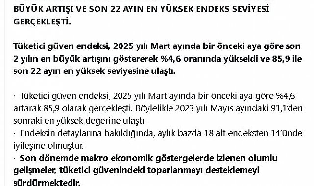 TİCARET Bakanı Ömer Bolat, tüketici güven endeksinin son 22 ayın en yüksek seviyesine ulaştığını açıkladı. Ticaret Bakanı Ömer Bolat, tüketici güven endeksi verilerine ilişkin sosyal medya hesabından yaptığı açıklamada, "Tüketici güven endeksi, 2025 yılı mart ayında bir önceki aya göre son 2 yılın en büyük artışını göstererek yüzde 4,6 oranında yükseldi ve 85,9 ile son 22 ayın en yüksek seviyesine ulaştı. Endeksin detaylarına bakıldığında, aylık bazda 18 alt endeksten 14'ünde iyileşme olmuştur. Son dönemde makroekonomik göstergelerde izlenen olumlu gelişmeler, tüketici güvenindeki toparlanmayı desteklemeyi sürdürmektedir. Dolayısıyla üretim-yatırım-istihdam-ihracat önceliklerinde Türkiye ekonomisindeki olumlu görünüm, temel göstergelerde de görüldüğü üzere devam etmektedir" dedi.