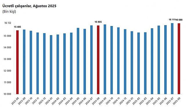 TÜRKİYE İstatistik Kurumu (TÜİK), ağustos ayında sanayi, inşaat ve ticaret-hizmet sektörleri toplamında ücretli çalışan sayısının yıllık yüzde 1,2 arttığını açıkladı. TÜİK, Ağustos 2025 dönemine ilişkin ücretli çalışan istatistiklerini açıkladı. Buna göre; sanayi, inşaat ve ticaret-hizmet sektörleri toplamında ücretli çalışan sayısı 2025 Ağustos ayında bir önceki yılın aynı ayına göre yüzde 1,2 arttı. Ücretli çalışan sayısı bir önceki yılın aynı ayında 15 milyon 904 bin 602 kişi iken, 2025 yılı Ağustos ayında 16 milyon 89 bin 450 kişi oldu. Ücretli çalışanların alt detaylarına bakıldığında; 2025 Ağustos ayında ücretli çalışan sayısı yıllık olarak sanayi sektöründe yüzde 3,6 azaldı, inşaat sektöründe yüzde 7,2 arttı ve ticaret-hizmet sektöründe yüzde 2,6 arttı.Sanayi, inşaat ve ticaret-hizmet sektörleri toplamında ücretli çalışan sayısı 2025 Ağustos ayında bir önceki aya göre yüzdesel olarak değişim göstermedi. Ücretli çalışanların alt detaylarına bakıldığında; 2025 Ağustos ayında ücretli çalışanlar aylık olarak sanayi sektöründe yüzde 0,6 azaldı, inşaat sektöründe yüzde 0,4 arttı ve ticaret-hizmet sektöründe yüzde 0,2 arttı.