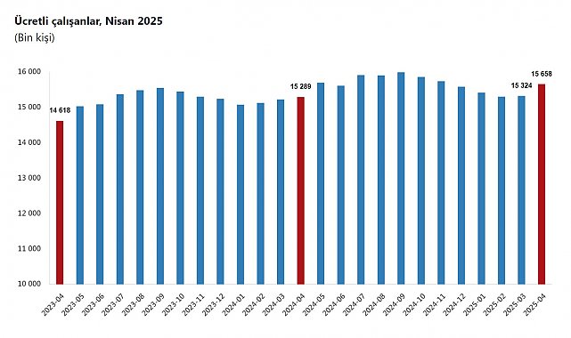 TÜRKİYE İstatistik Kurumu (TÜİK), sanayi, inşaat ve ticaret-hizmet sektörlerinde toplam ücretli çalışan sayısının nisan ayında yıllık yüzde 2,4, aylık yüzde 0,7 arttığını açıkladı.TÜİK, Nisan 2025 dönemine ilişkin ücretli çalışan istatistiklerini açıkladı. Buna göre; sanayi, inşaat ve ticaret-hizmet sektörlerinde toplam ücretli çalışan sayısı bir önceki yılın aynı ayına göre yüzde 2,4 arttı. Ücretli çalışan sayısı bir önceki yılın aynı ayında 15 milyon 289 bin 223 kişi iken, 2025 yılı nisan ayında 15 milyon 658 bin 462 kişi oldu. Ücretli çalışanların alt detaylarına bakıldığında; 2025 Nisan ayında ücretli çalışan sayısı yıllık olarak sanayi sektöründe yüzde 1,3 azaldı, inşaat sektöründe yüzde 7,3 arttı ve ticaret-hizmet sektöründe yüzde 3,6 arttı.Sanayi, inşaat ve ticaret-hizmet sektörlerinde toplam ücretli çalışan sayısı 2025 Nisan ayında bir önceki aya göre de yüzde 0,7 arttı. Ücretli çalışanların alt detaylarına bakıldığında; 2025 Nisan ayında ücretli çalışanlar aylık olarak sanayi sektöründe yüzde 0,4 arttı, inşaat sektöründe yüzde 2,4 arttı ve ticaret-hizmet sektöründe yüzde 0,6 arttı.