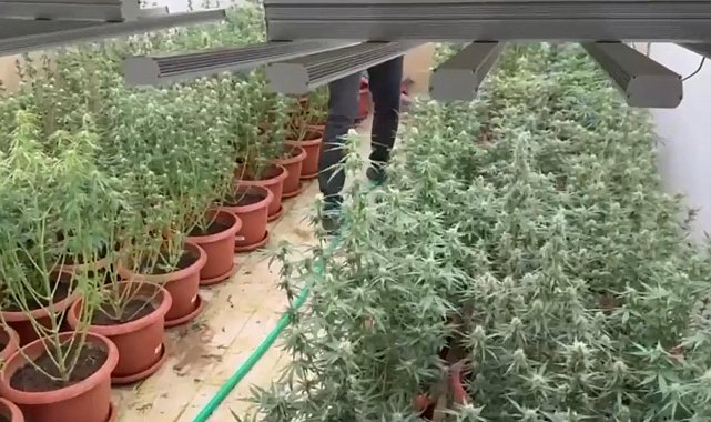 İZMİR'in Aliağa ve Menemen ilçelerinde 2 villada kurulan serada özel düzenekle yetiştirilen 212 kök kenevir ile 9 kilo 350 gram esrar ele geçirildi, 3 şüpheli tutuklandı.Narkotik Suçlarla Mücadele Şube Müdürlüğü ekipleri, uyuşturucu veya uyarıcı madde ticareti yapanlara yönelik çalışma yaptı. Aliağa ve Menemen ilçelerinde 2 villada kenevir yetiştirildiği tespit edildi. Polis ekiplerinin önceki gün adreslere düzenlediği operasyonda villalarda kurulan serada özel düzeneklerle yetiştirilen 212 kök kenevir bitkisi ile 9 kilo 350 gram esrar ele geçirildi. Operasyon kapsamında O.G., C.A. ve İ.G., gözaltına alındı. Emniyetteki işlemlerinin ardından adliyeye sevk edilen şüpheliler tutuklandı.