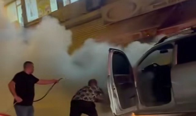 MARDİN'in Kızıltepe ilçesinde seyir hakindeyken alev alan hafif ticari araçtaki yangını çevredekiler çeşme hortumuyla söndürmeye çalıştı. O anlar, cep telefonuyla görüntülendi. İpek Mahallesi Ali Ertaş Caddesi Dedeman Kavşağı'nda gece saatlerinde sürücüsünün ismi öğrenilmeyen 48 AIR 824 plakalı hafif ticari araç, henüz belirlenemeyen nedenle, seyir halindeyken motor kısmından alev aldı. Durumu fark eden sürücü, aracı yol kenarında durdurup 112 Acil Çağrı Merkezi'ne ihbarda bulundu. Çevredekiler ise çeşme hortumuyla yangına müdahale etti. İtfaiye ekiplerinin müdahalesiyle kontrol altına alınıp söndürülen yangında, araç zarar gördü. Hortumlu müdahale anları cep telefonu kamerasıyla kaydedilirken, yangının çıkış nedeninin belirlenmesi için inceleme başlatıldı.