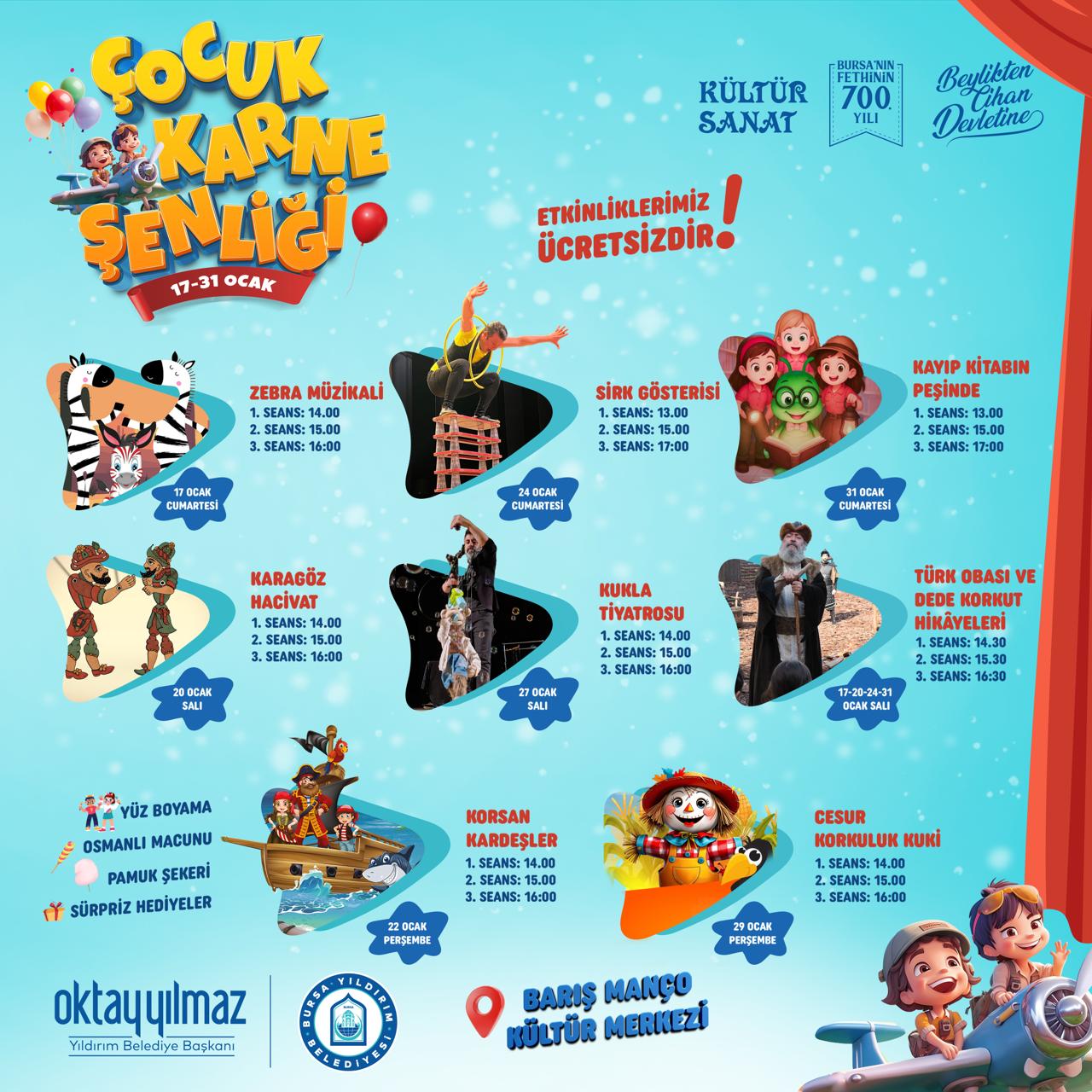Eğitimden spora, kültürden sanata kadar gençleri ve çocukları hayatın her alanında destekleyen Yıldırım Belediye Başkanı Oktay Yılmaz, Yıldırım Kaymakamı Metin Esen ve İlçe Milli Eğitim Müdürü Mustafa Sevinç ile birlikte Değirmenönü İlkokulu’nda düzenlenen karne törenine katıldı. Öğretmenler odasını ziyaret ederek öğretmenlerle sohbet eden Başkan Oktay Yılmaz, ardından da Kaymakam Metin Esen ve İlçe Milli Eğitim Müdürü Mustafa Sevinç’le birlikte sınıfları gezdi. Yakından ilgilendiği öğrencilere çeşitli hediyeler veren Başkan Yılmaz, 2025-2026 Eğitim Öğretim Yılı’nın ilk dönemini tamamlayan miniklere karnelerini dağıttı. BAŞKAN’DAN KARNE HEDİYESİKarnelerini alarak ara yıl tatiline giren çocukları tebrik eden Yıldırım Belediye Başkanı Oktay Yılmaz, “Tüm öğrencilerimizi gösterdikleri azim ve çalışkanlıktan dolayı kutluyorum. Eğitim dönemi boyunca hep yanında ve destekçisi olduğumuz çocuklarımızı yarıyıl tatilinde de unutmadık. Tüm çocuklarımızı bir dönemin yorgunluğunu atmaları ve eğlenceli anlar geçirmeleri için 17-31 Ocak tarihlerinde düzenleyeceğimiz Yıldırım’da Karne Şenliği’ne bekliyoruz. Karne sevinci yaşayan şehrimizdeki tüm öğrenci, öğretmen, veli ve okul yöneticilerimizi tebrik ediyorum” ifadelerini kullandı.EĞLENCELİ ETKİNLİKLERYıldırım Belediyesi Kültür Sanat ve Sosyal İşler Müdürülüğü, çocukların dolu dolu bir tatil geçirmeleri için 17-31 Ocak tarihleri arasında Karne Şenliği düzenliyor. Barış Manço Kültür Merkezi’nde düzenlenen şenliklerde biribirinden eğlenceli etkinlikler ücretsiz şekilde çocuklarla buluşacak. Karne Şenlikleri kapsamında; 17 Ocak’ta Zebra Müzikali, 20 Ocak’ta Hacivat ve Karagöz oyunu, 22 Ocak’ta Korsan Kardeşler oyunu, 24 Ocak’ta sirk gösterisi, 27 Ocak’ta kukla tiyatrosu, 29 0cak’ta Cesur Korkuluk Kuki oyunu, 31 Ocak’ta Kayıp Kitabın peşinde oyunu ve 17-20-24-31 Ocak’ta ise Türk Obası ve Dede Korkut Hikayeleri çocuklarla buluşacak.